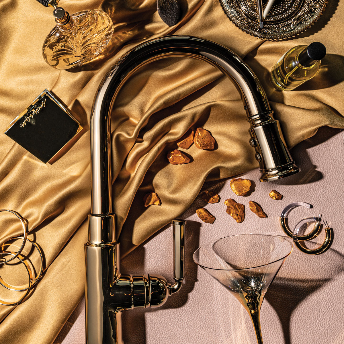 “There is something really feminine and provocative about the polished gold, the way it looks sleek and elegantly beautiful,” says Lucia Bayt, brand manager for Brizo. “Those details also make it a little bit more provocative. You want to touch the metal buttons on that wand.”