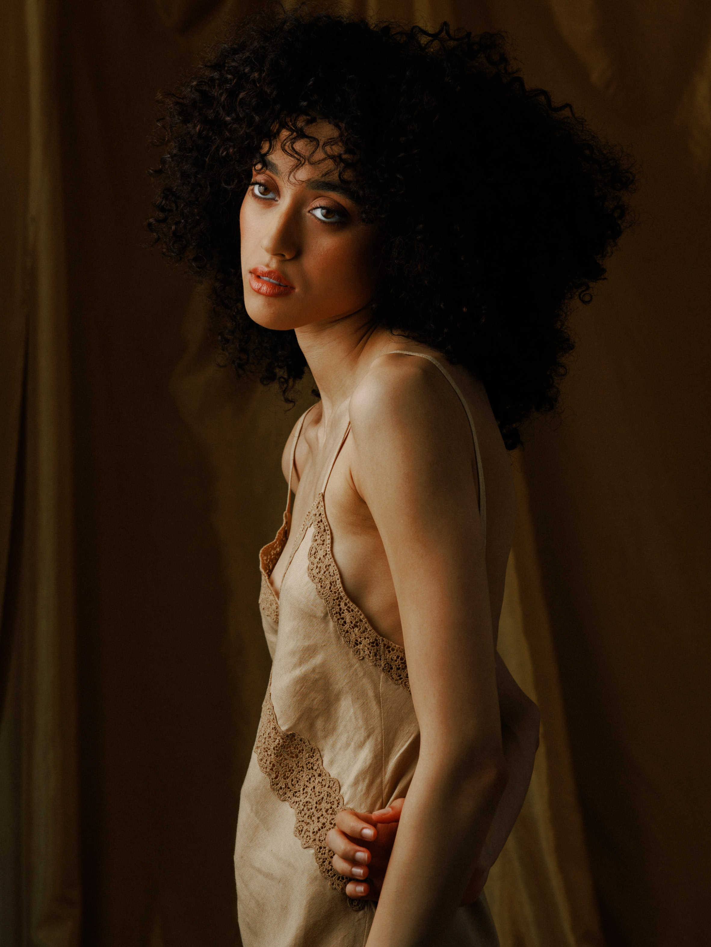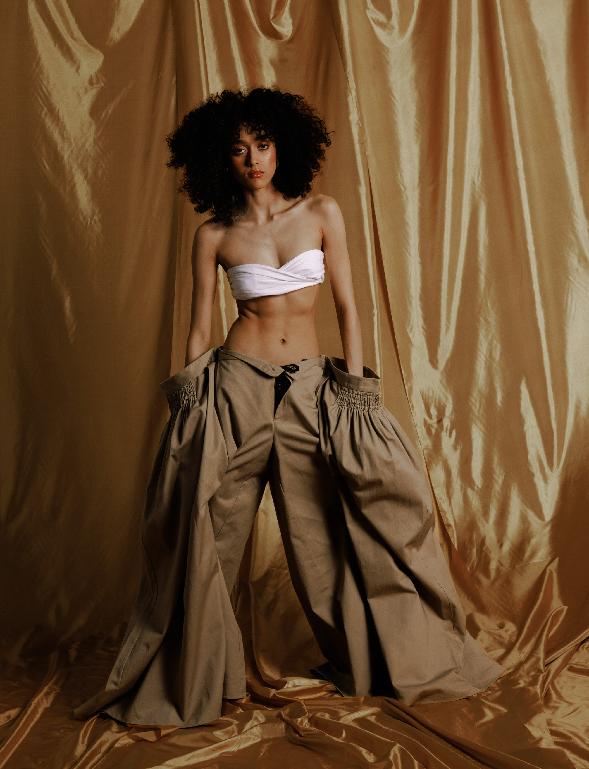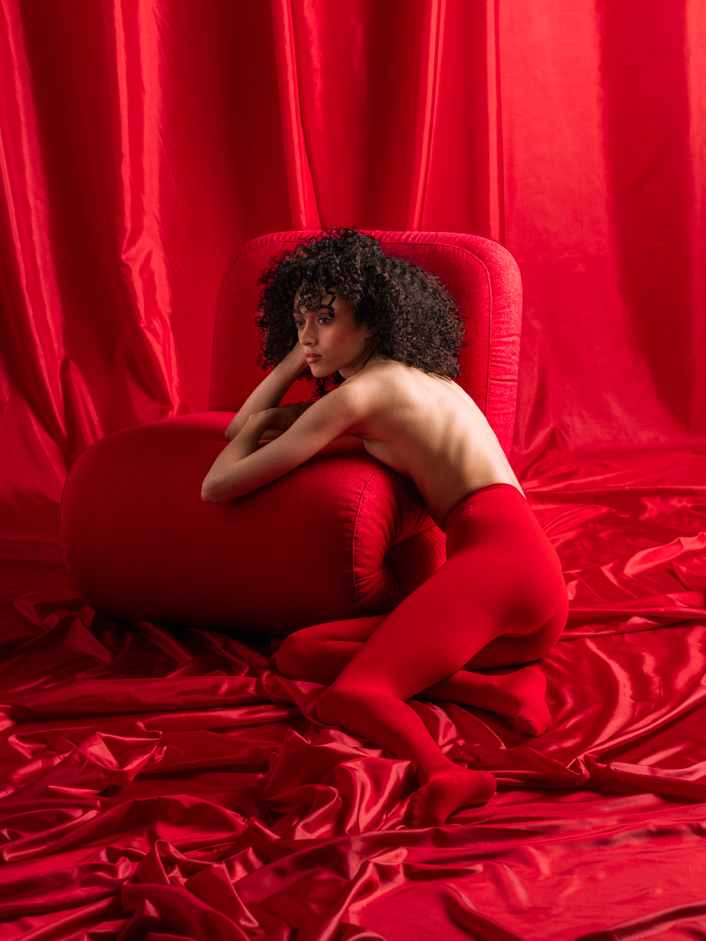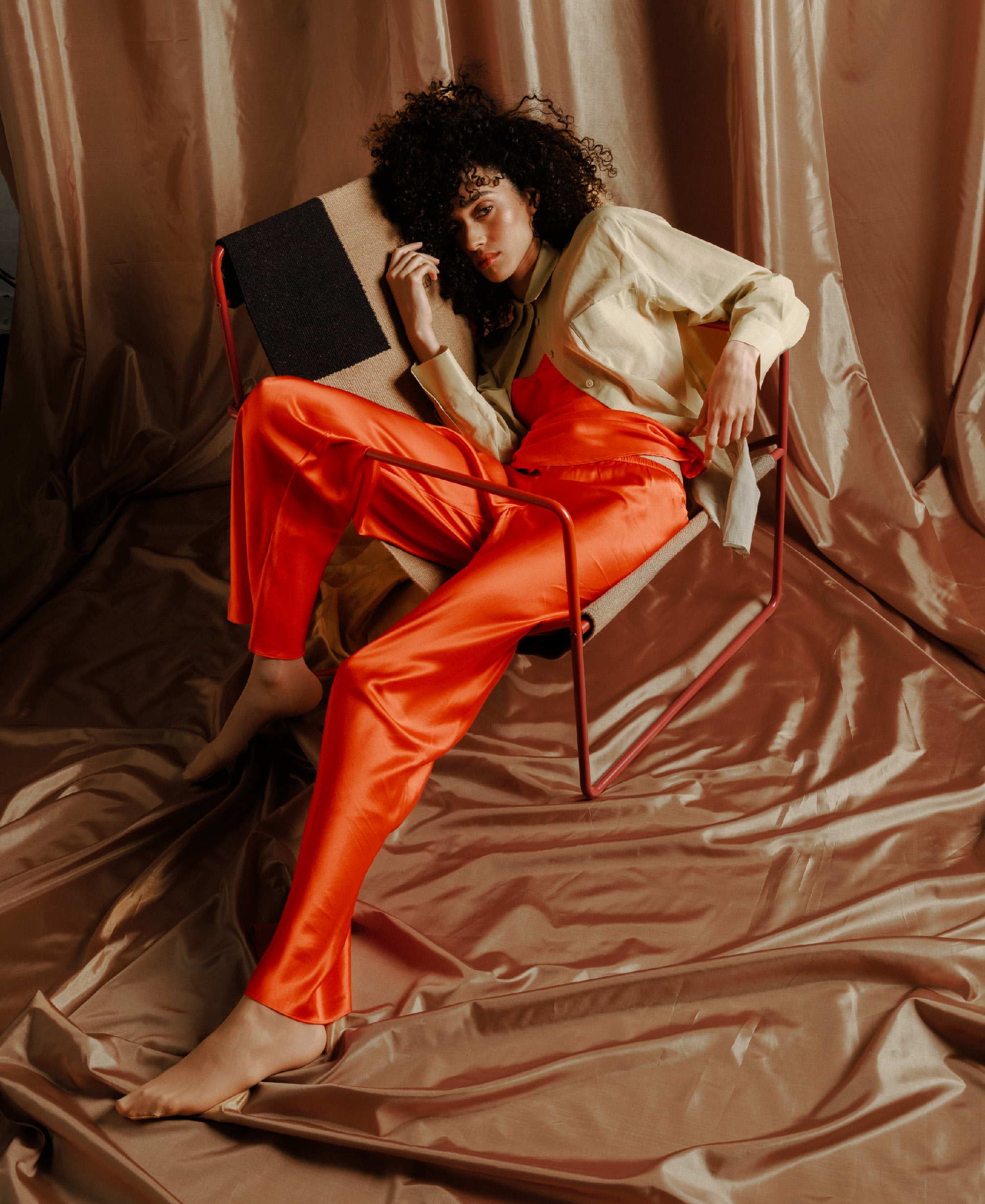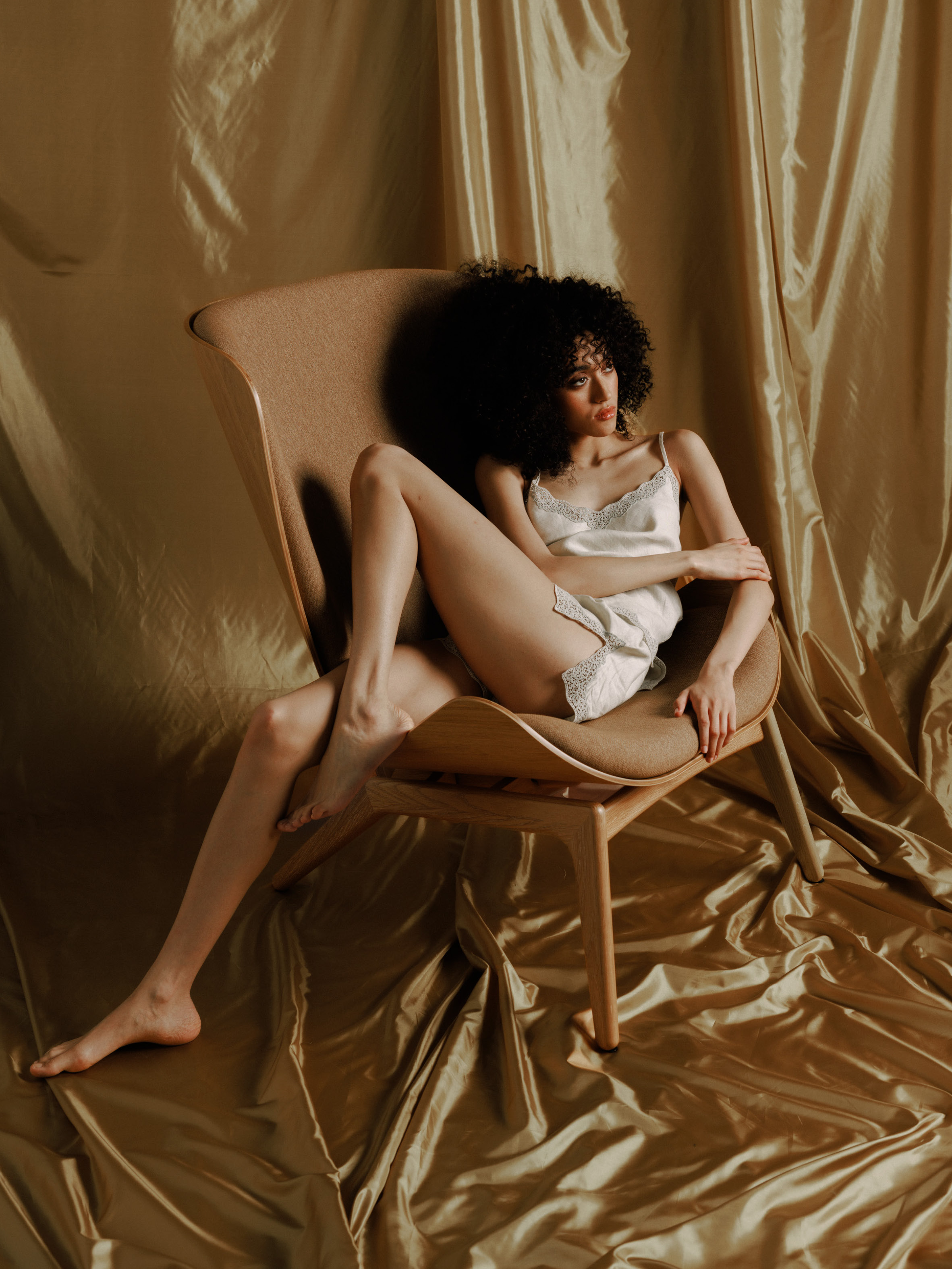 UMAGE’s Reader Wing chair lets your body sink in and relax. Pictured in oak and sugar brown, the chair’s curved shell is inspired by Danish crafting techniques helping to reduce surrounding noise and offering a place of shelter and reflection. With its light form and organic curves, The Reader is just right for enjoying a good book or engaging conversation. Lingerie from Loro Piana’s Lingerie Capsule in pure linen. Top and pants by Puppets and Puppets.