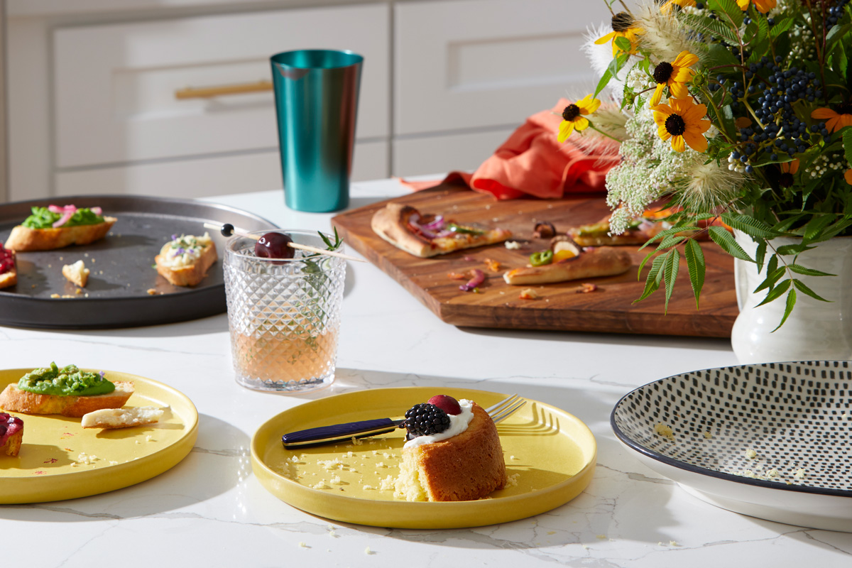 The best parties seem to happen in the kitchen, but that goes beyond great apps. Give guests something interactive to do and break the ice by setting up an easy make-your-own pizza station. Everyone loves pizza, and it relieves the host from all of that cooking and catering to guests’ food preferences. Set out some colorful dishes like those from Le Creuset to add vibrance, and sprinkle in some crowd favorite snacks while guests wait to step up to the Breville Smart Oven® Pizzaiolo to make their own flatbread.