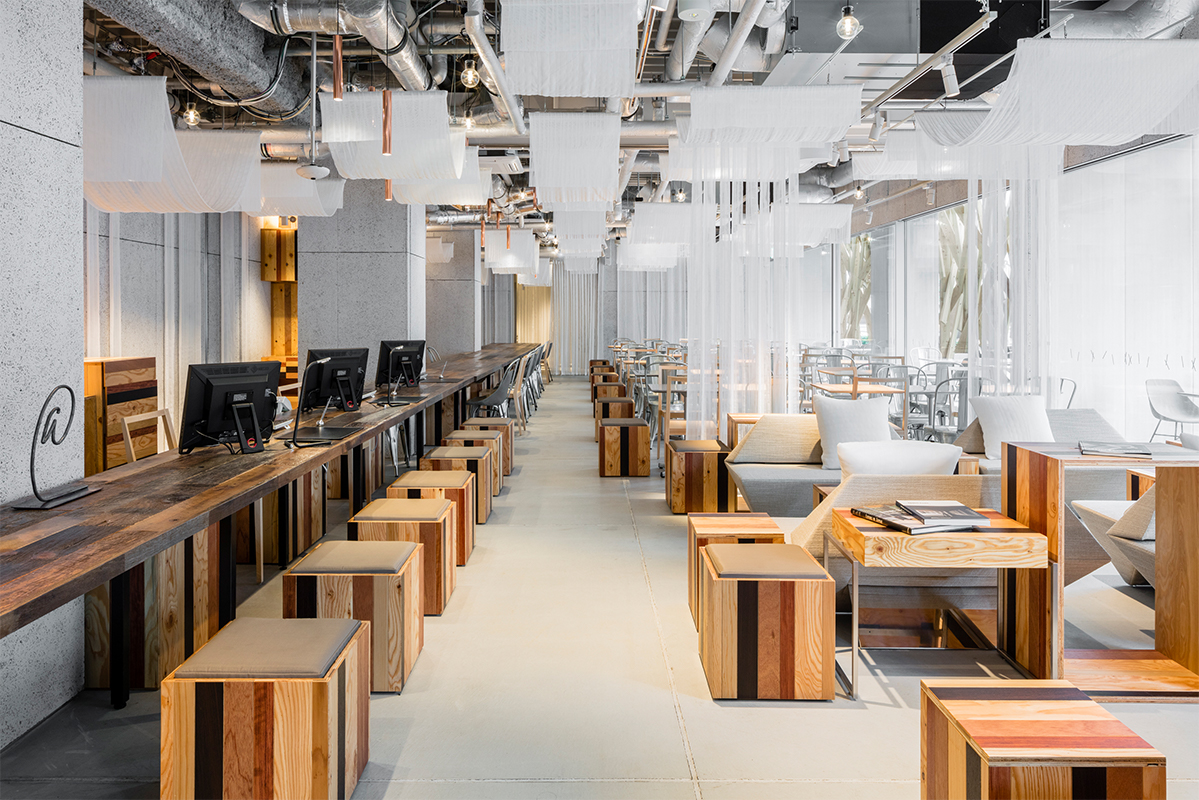 - One@Tokyo’s lounge area, with a contrast of industrial and natural wood touches.
