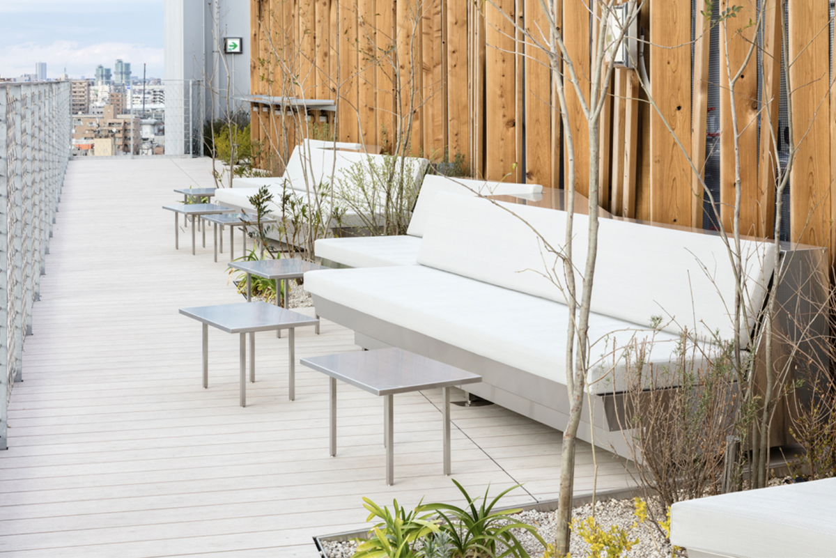 - A view of the minimalist furniture at One@Tokyo’s Skytree rooftop lounge.