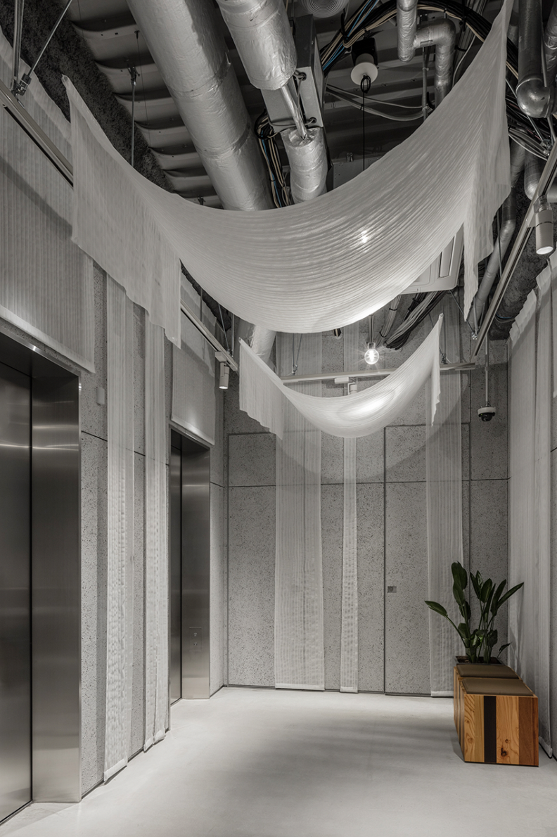 - The slate-gray industrial style elevator area at One@Tokyo.
