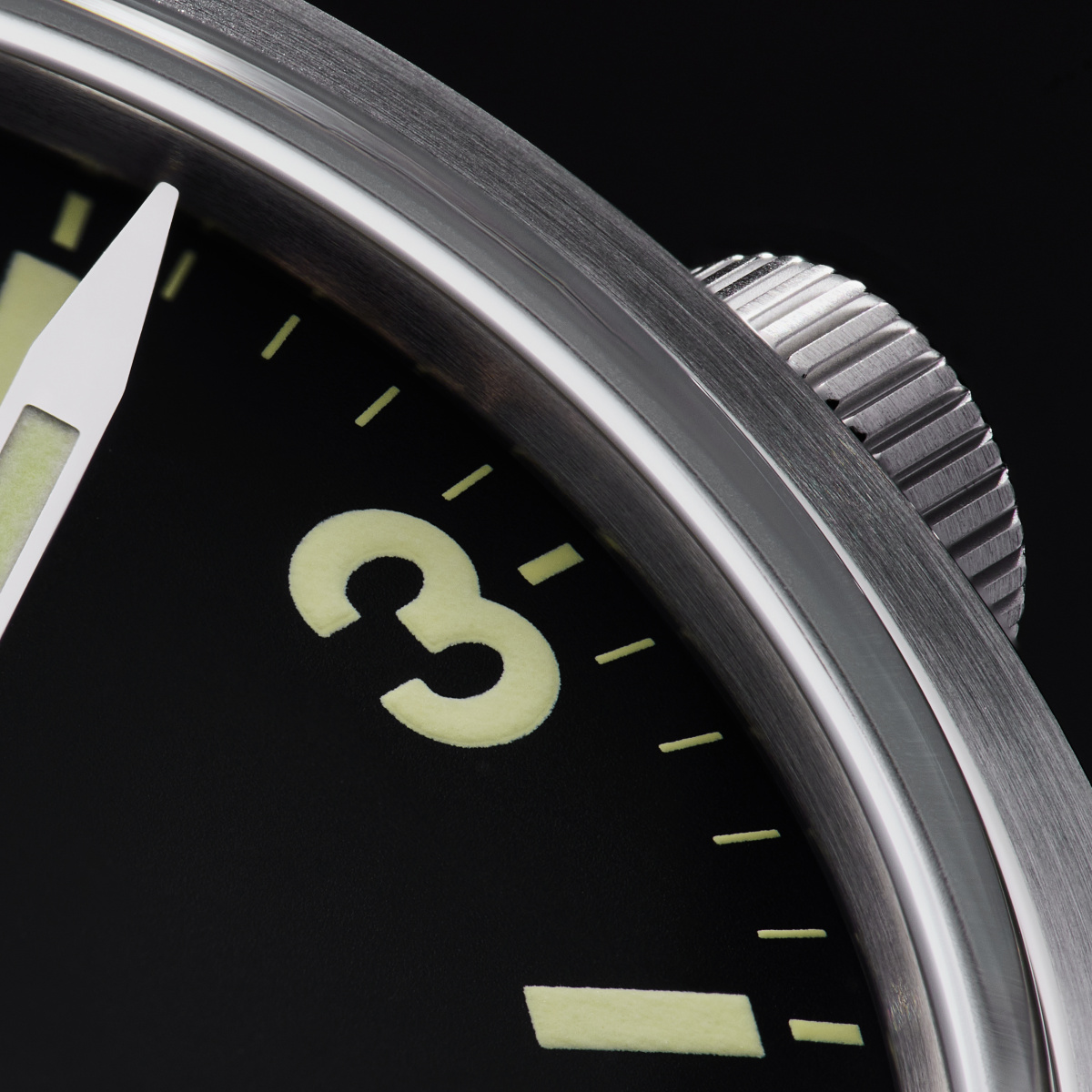 - The dial is matte black with hour markers painted in grade A Swiss Super-LumiNova luminescent material.
