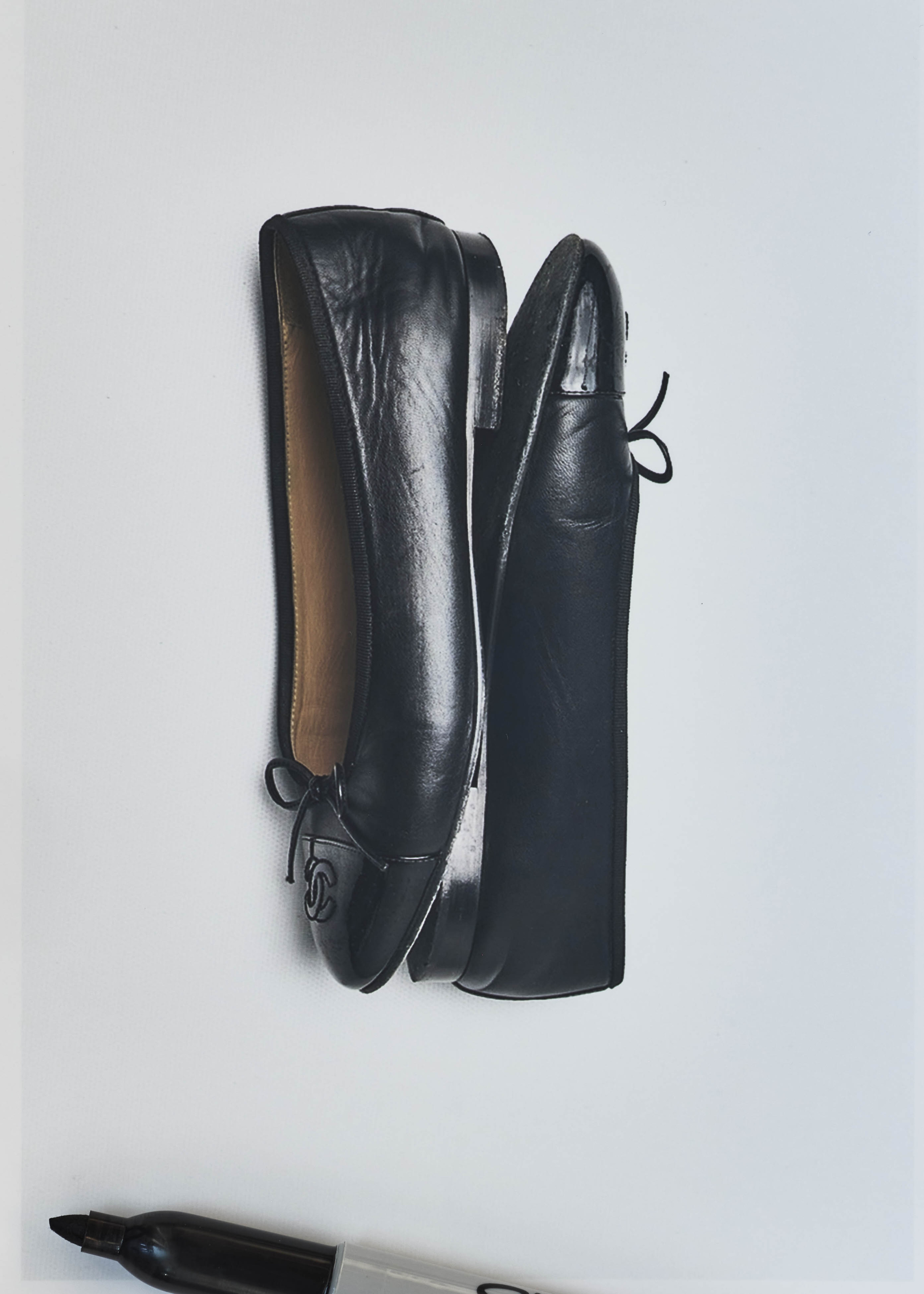 ← When Elizabeth walks into the studio for the first time—especially if she’s meeting big talent—her approach is simple: “I’m always professional and super nice.” she says. “Everyone should be.” Flats: Vintage Chanel