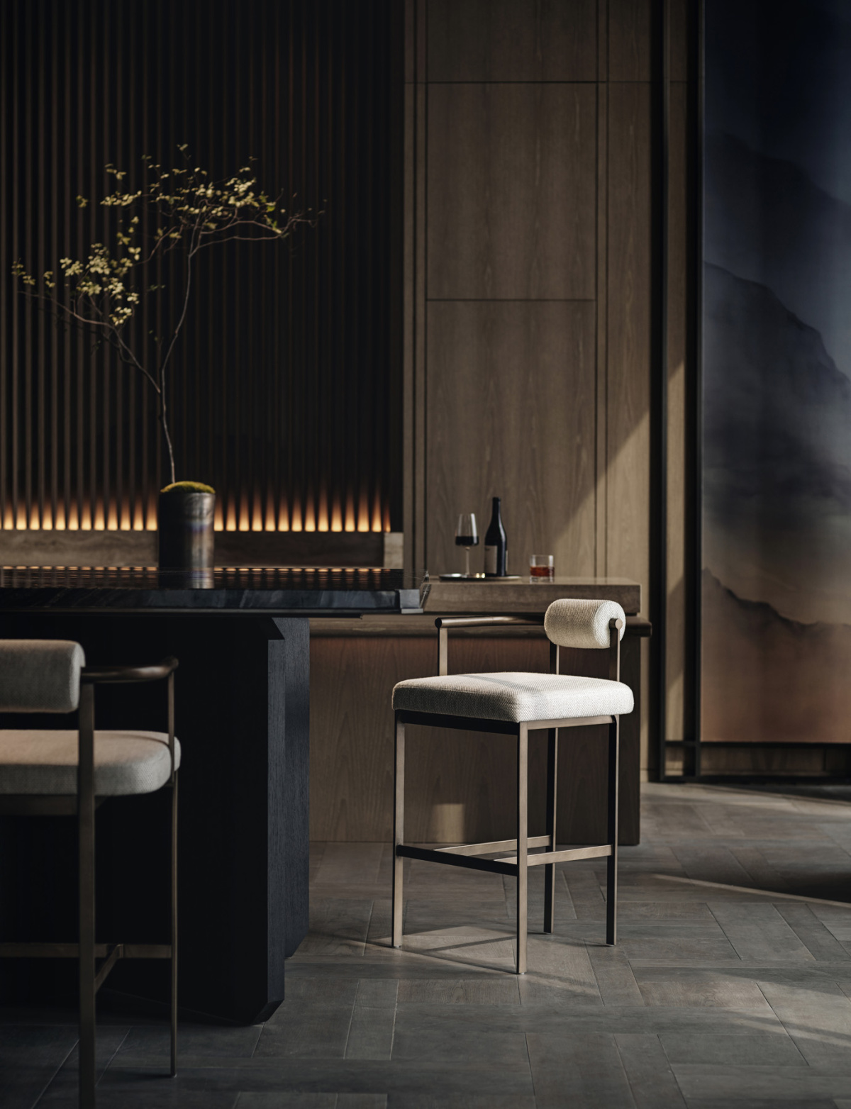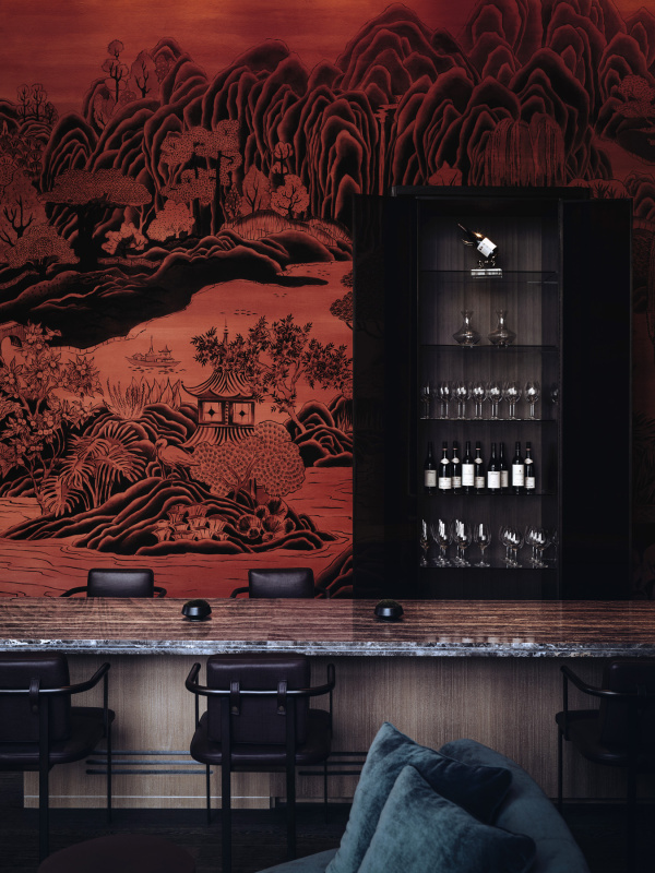 George: This space has a cinematic quality reminiscent of Wong Kar-wai’s work in In the Mood for Love with that nostalgic, sexy atmosphere. It’s like a nod to the past. This is more of a bar or a cafe-bar. The previous area was more of a space where a chef might come up to cook during meetings, but here we were focused on creating a dramatic, cinematic feel.