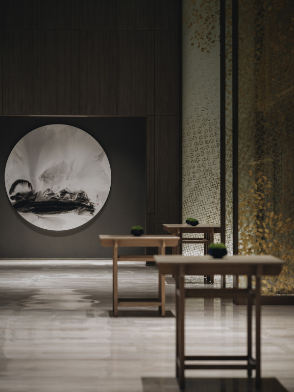 George: This is a pre-ballroom area. The golden screens you see along the hallway create a visual rhythm and foreshorten the space. The tables are inspired by Chinese scholar brush paintings. They were placed intentionally to maintain a sense of presence even when the rooms aren’t in use. The hallway is actually quite large with meeting rooms on either side. We wanted to avoid that empty, transitional feel typical of pre-function spaces.