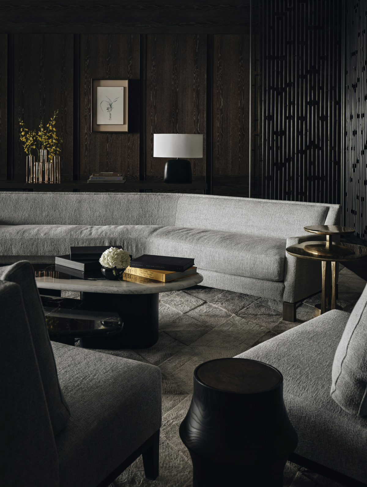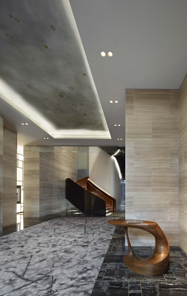 The walls in the lobby are inspired by fashion designer Halston’s use of ultra-suede in the 1970s. Instead of traditional wood paneling with trim, Yabu Pushelberg used a chamfered design to create a modern, textured effect.