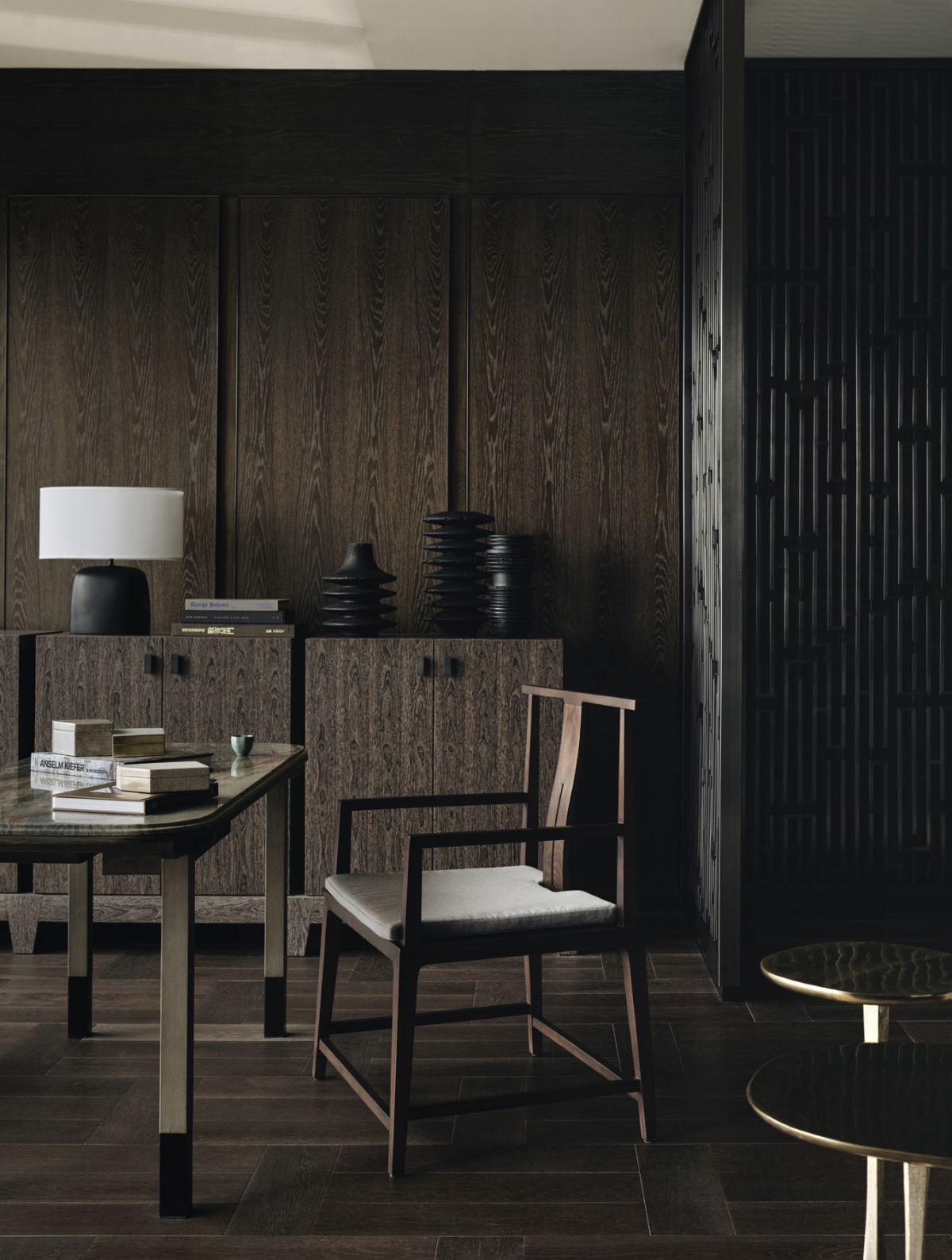 “This is a pre-ballroom area. The golden screens you see along the hallway create a visual rhythm and foreshorten the space. The tables are inspired by Chinese scholar brush paintings. They were placed intentionally to maintain a sense of presence even when the rooms aren’t in use,” says George.