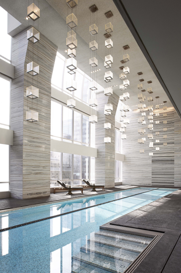 George: The lighting throughout the hotel actually echoes the design of the ballroom. The light fixtures here in the pool atrium are cube-shaped and sort of float above the space. The onyx walls in the ballroom are more vertically oriented, while the atrium’s lights have a more horizontal composition. They reflect beautifully in the pool below. The verticality of the design also speaks to Manhattan itself with its upward-reaching architecture. The triple-height glazing was a generous amount of space to allocate to the project.