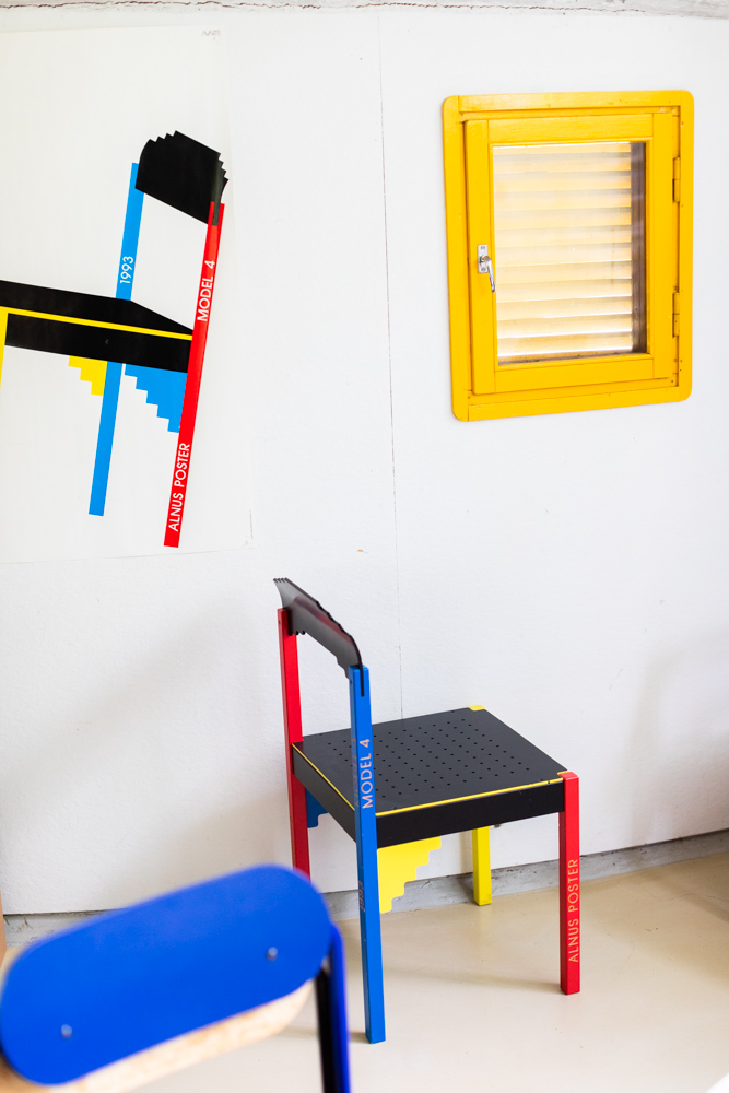 - Yrjö’s designs sit along the studio windows: White Piling plastic chair i419, in production 1968-76; Saturnus coffee table, 1965, still in production; small B&W rotating chair 415, 1965-78