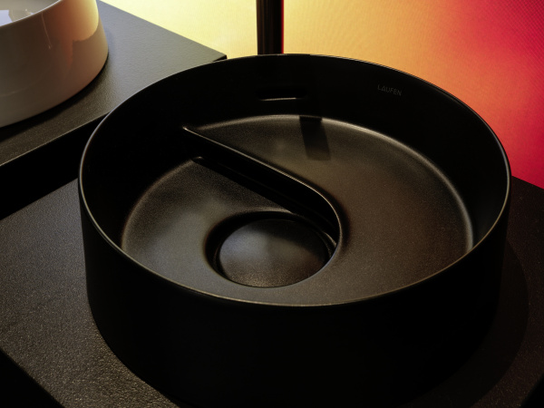 The design features a two-level interior that creates a circular movement of the water. “With a flat-bottom sink, debris usually collects at the edges and you have to clean it a lot,” he explained. “But in this river-like design, debris moves around.” Photo courtesy of LAUFEN
