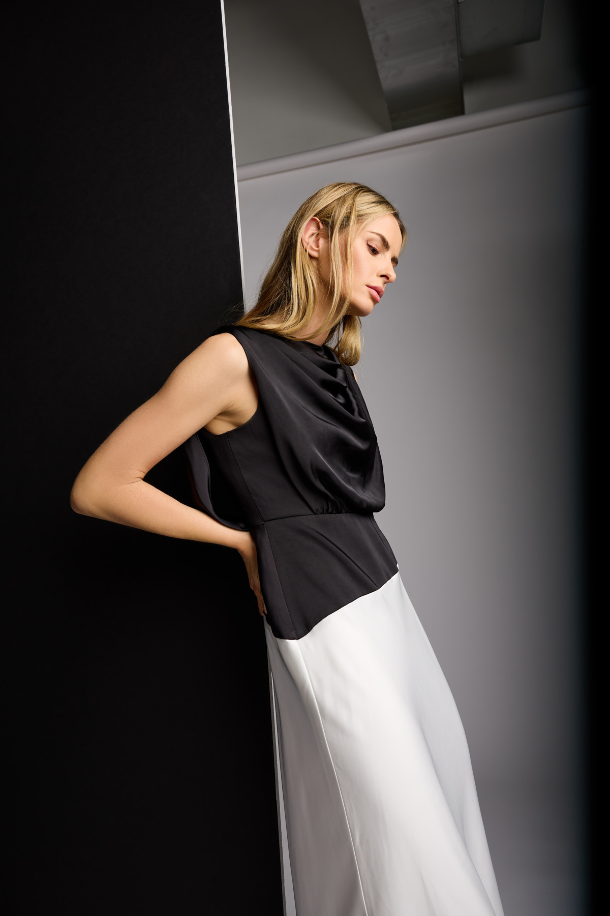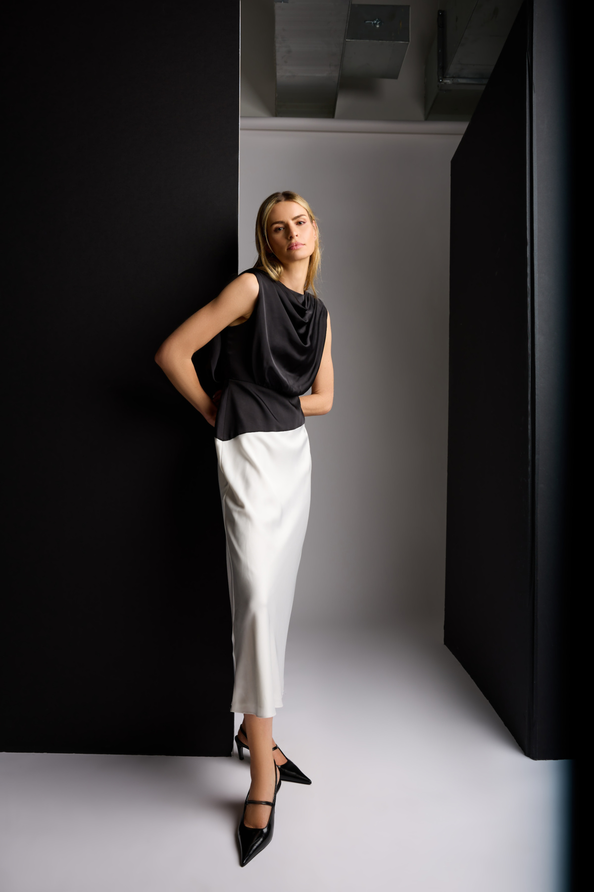 His upcoming Zac Posen Resort 2024 collection draws inspiration from the otherworldly beauty of water landscapes and the mesmerizing interplay between light and reflections. The color story is a study of the contrasting magic hours, from dawn to dusk and sunrise to sunset. Colorblocking is featured in timeless, classic silhouettes with contrasting combinations to reinforce the chromatic dichotomy of this season’s palette.